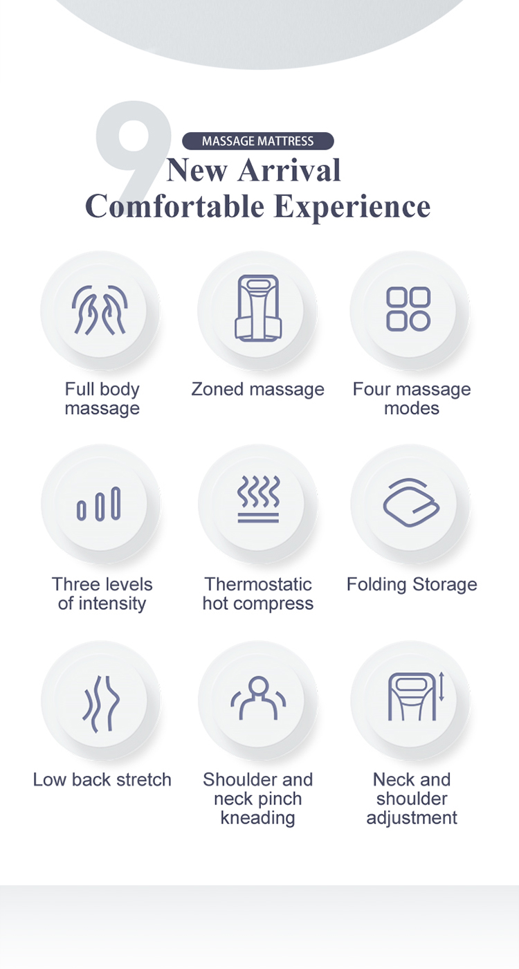 Precise massage: Equipped with multiple intelligent airbags, it can accurately simulate the techniques of professional massage therapists, providing targeted massage for key areas such as shoulders, neck, waist, back, and legs to relieve muscle tension and soreness. Each massage is like the careful care of a professional massage therapist, gradually relieving fatigue. Airbag lifting: A unique airbag lifting system designed according to ergonomics, which moderately stretches the spine during massage, like a pair of gentle and powerful hands, gently returning the spine to its original position. Users can clearly feel their bodies being stretched, and long-term use can help correct poor posture, reduce spinal pressure, promote natural body repair, and easily achieve a straight and upright posture. Constant temperature heat dissipation: The mattress is equipped with advanced constant temperature heat dissipation technology to always maintain a comfortable sleeping temperature. In the scorching summer, you won't be awakened by the stuffiness in your sleep. The cool touch is like a gentle breeze, accompanying you to a good night's sleep; In cold winter days, you won't feel cold due to rapid heat dissipation. Warmth and even coverage will envelop you, ensuring a pleasant sleeping environment and creating a spring like sleeping experience throughout the four seasons. Comfortable Material: Made of high-quality breathable and skin friendly fabric, filled with soft and supportive memory cotton, warm in winter and cool in summer, fitting the curves of the body, providing a comprehensive and comfortable wrapping feeling, as if you are on top of clouds, comfortable and reassuring. Deep sleep: After professional testing, the synergistic effect of airbag massage, lifting, and constant temperature heat dissipation can help users fall asleep faster, significantly prolong deep sleep time, wake up refreshed, and start a day full of vitality. Customized wholesale advantages: We have a professional customization team that can customize the appearance design, massage program, size specifications, and other aspects of the mattress according to your brand positioning and market demand. At the same time, it has the ability to produce on a large scale, efficiently undertake wholesale orders, strictly control product quality, provide highly competitive prices and comprehensive after-sales service, ensuring worry free procurement for you.
